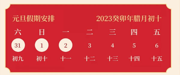 根據國家法定假期的規定,結合我司實際情況,就2023年元旦放假安排通知如下: