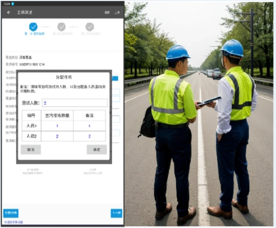 1)工單測試任務分配:系統內置一個智能任務分配??椋菹殖〔饈勻嗽斃棖螅?/span>行分配。每個測試人員在系統中接收分配到的具體任務,包括測試地點、任務類型等詳細信息。