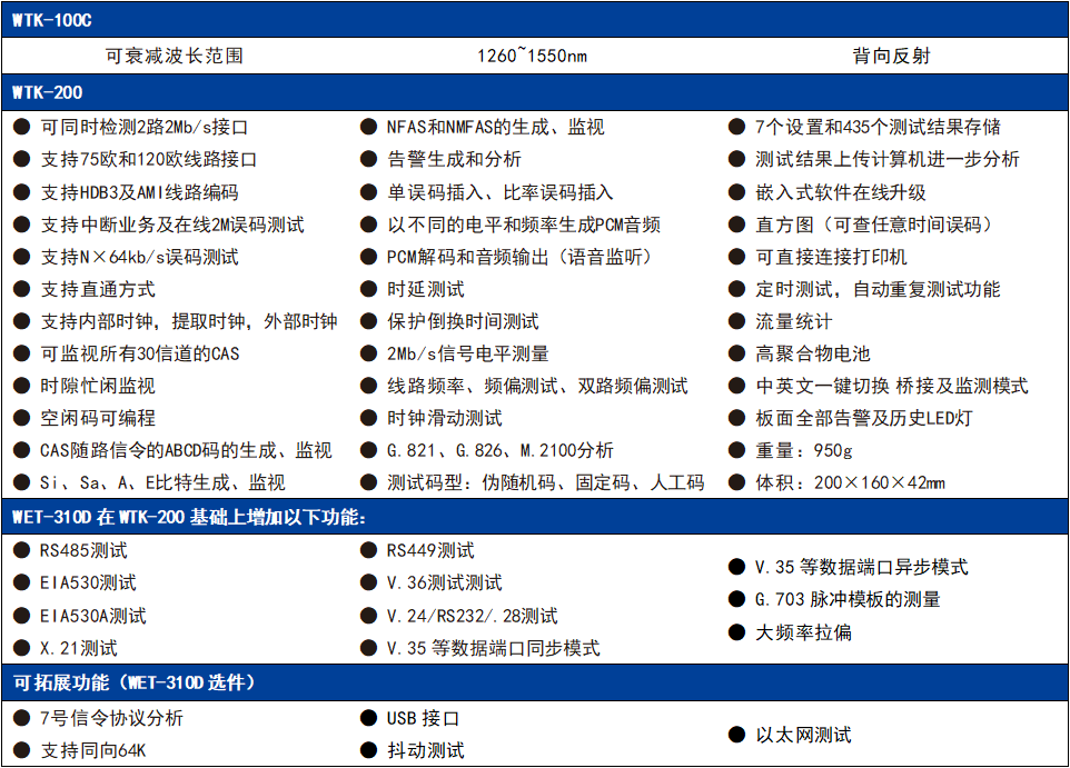 新推出的系列2M及數據鏈路綜合測試儀可用于測量與分析傳統E1傳輸系統的性能參數并處理各種故障。它們集誤碼測試、幀結構分析、時隙分析、信念測試、信號分析、告警分析、PCM仿真等多種功能于一體。WET-310D還擁有更豐富的功能及選件功能。