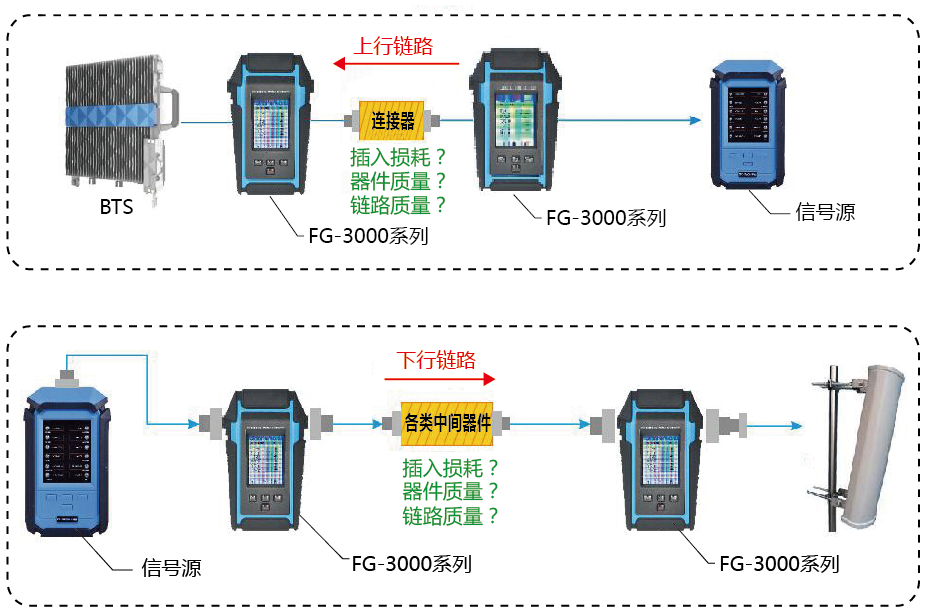 在實際的基站設計和建設過程中,工程人員把注意力集中在下行鏈路的覆蓋和優化方面,而忽視了上行鏈路對整個系統的影響。這樣,就會在基站建成啟用之后,出現接收終端信號顯示充足,但卻異常掉話甚至無法呼出的現象。這種故障通常都是天饋系統的上行鏈路和下行鏈路在信號強度上出現了不平衡導致的。下行鏈路損耗是否過大有很多方法可以測試;但是,測量上行鏈路損耗時,接收終端不可能作為穩定的信號源,因此有便攜、穩定功率的射頻源就顯得尤為重要。室分系統為上行受限系統,上行損耗過大的故障占鏈路不平衡故障中的絕大部分,而查找是連接點還是連接器件的問題就需要有專用的鏈路設備進行測試。